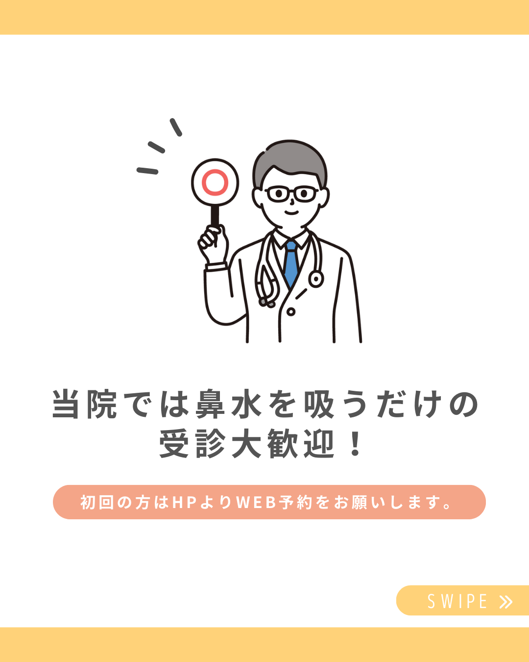 当院では鼻水を吸うだけの受診大歓迎! 初回の方はHPよりWEB予約をお願いします。