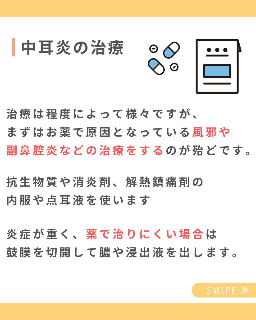 抗生物質や消炎剤、解熱鎮痛剤の内服や点耳薬を使います。