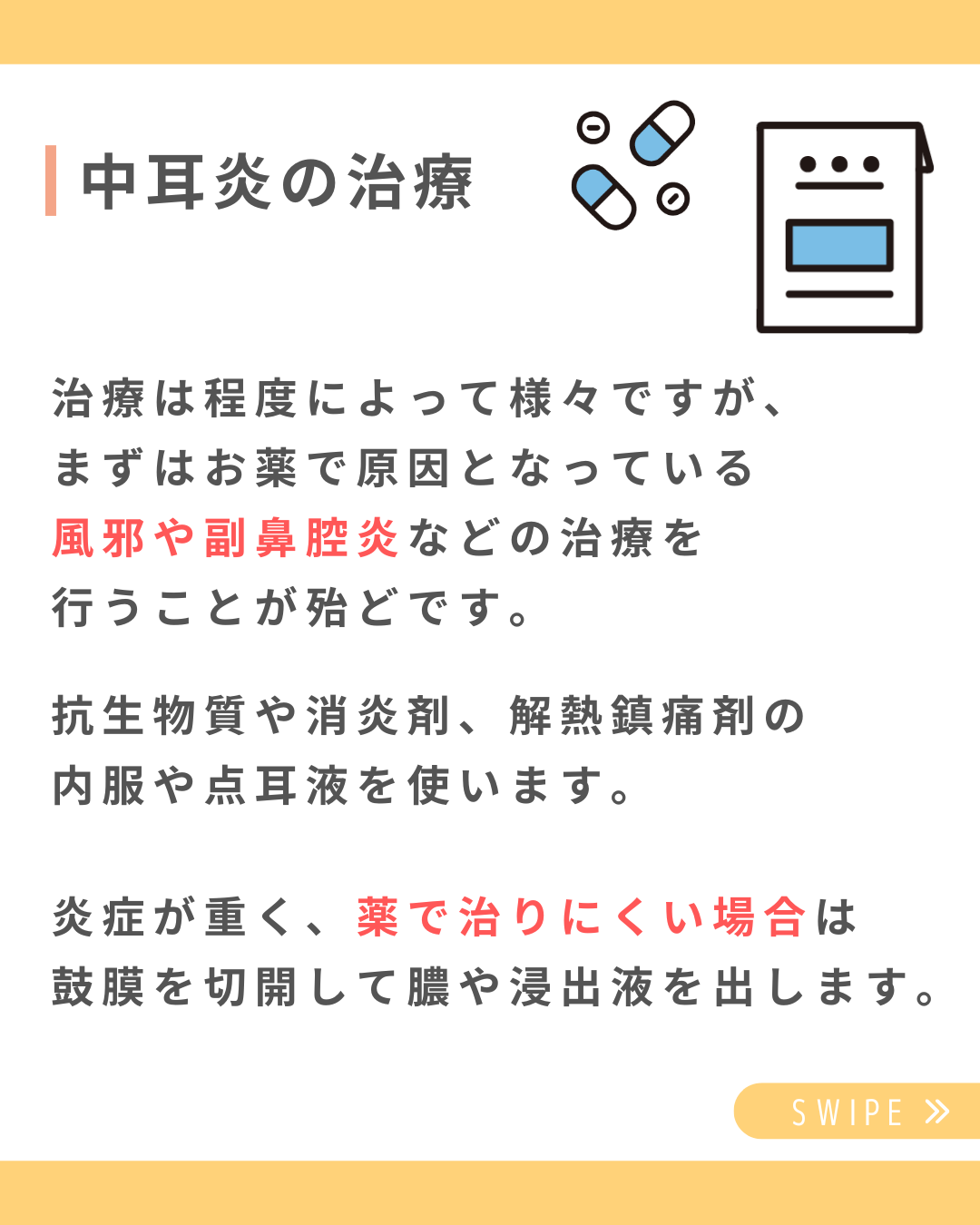 抗生物質や消炎剤、解熱鎮痛剤の内服や内耳液を使います。