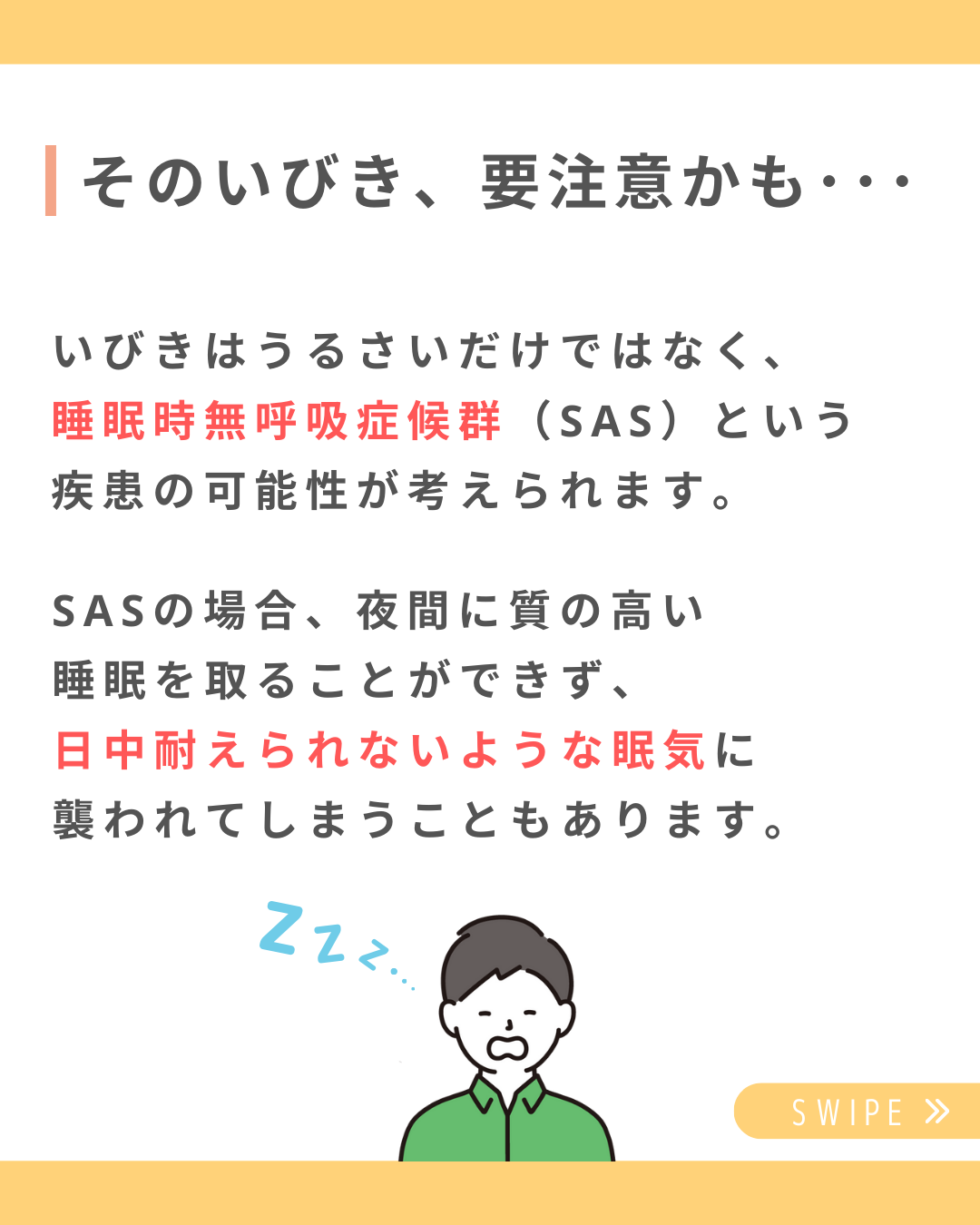 睡眠時無呼吸症候群(SAS)という疾患の可能性が考えられます。