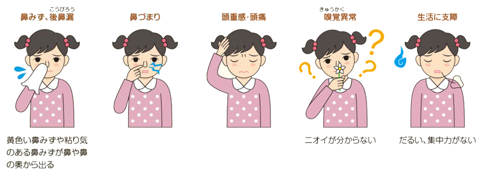 黄色の粘稠な鼻水・後鼻漏・鼻づまり、頭痛、嗅覚異常、頬の痛み、鼻が臭う、鼻血、せき(10日以上続く)、痰、口臭、いびき・睡眠障害の原因になることがあります。