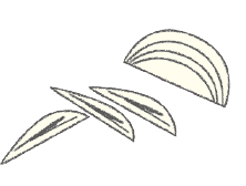 ❶ 皮をむいたタマネギ1個を半分に切り、薄切りにする