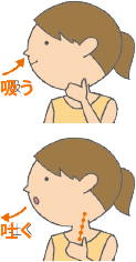 ❸ 小さな低い声で「ウーン」といい続けながら、おなかをヘこませるようにして、鼻から息をゆっくり長く吐く