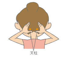 ❶ 後ろ髪の生え際辺り、2本の太いすじの外側のくぼみにある「天柱」のツボを、親指でギューッと力を込めて、5抄ほど押す。これを4〜5回くり返す。