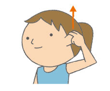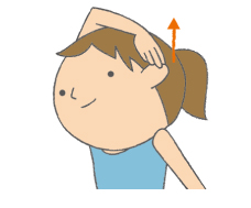 ※首の両横にある太い筋肉(胸鎖乳突筋)もいっしょに伸ばすように耳をひっぱると、さらに効果的